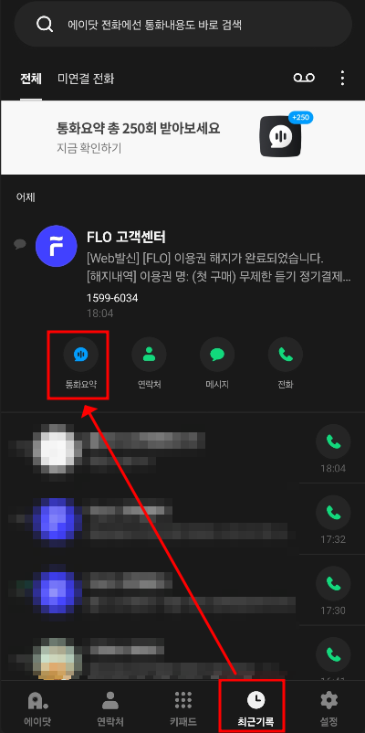 우선 에이닷 전화아이콘을 누르고 > '통화요약'을 눌러봅니다.