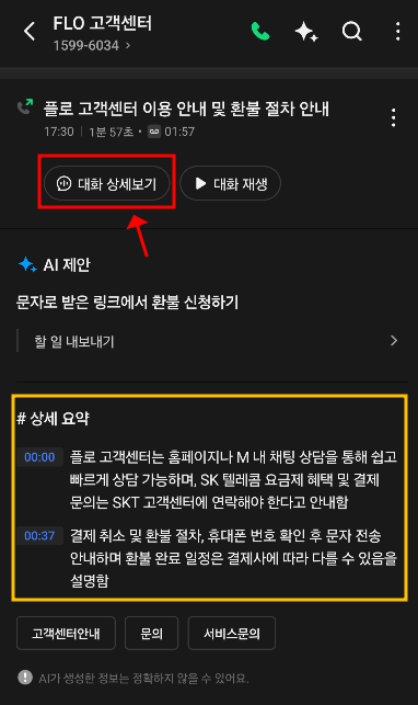 상단에 '대화 상세보기' 버튼을 눌러보면 음성 통화내역 전체가 글로 표시되게 됩니다