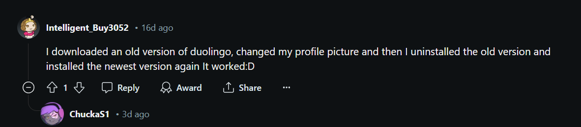 듀오링고 이전버전을 삭제하고 > 듀오링고 구버전을 다운로드 한다음 설치해서 사진프로필을 바꾸고 >