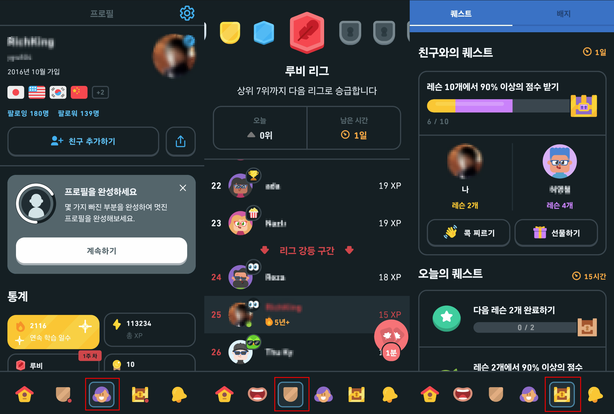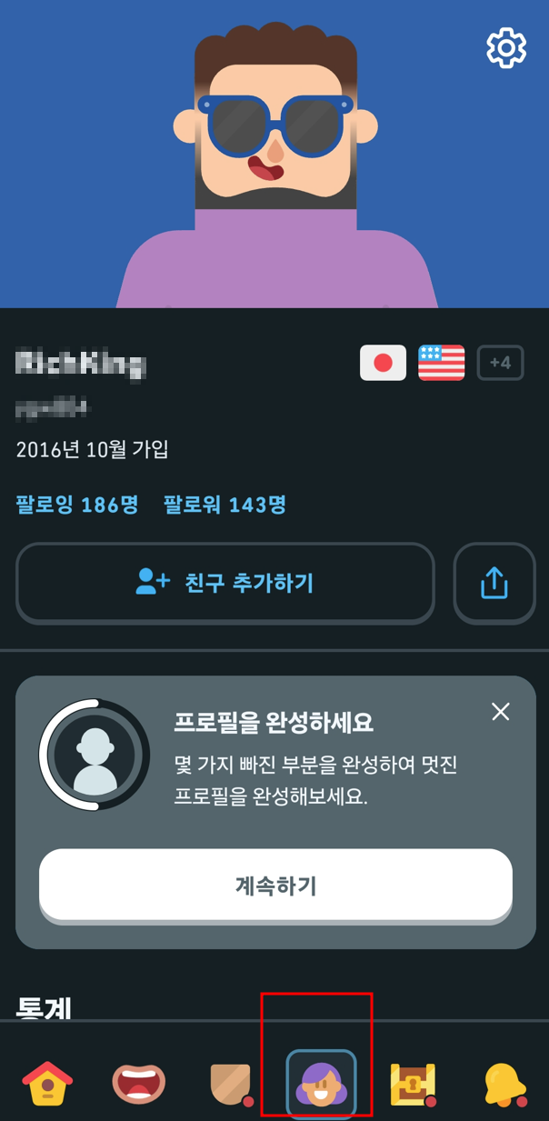 6) 듀오링고를 실행하고 프로필이 잘 보이는지 확인해 봅니다.