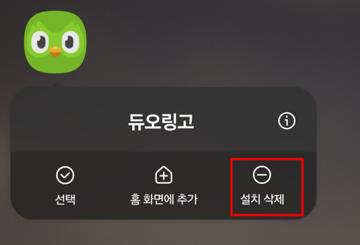 1) 지금 스마트폰에 설치되어 있는 듀오링고앱을 삭제합니다.