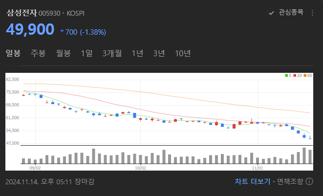 수능날인 오늘 대한민국 시총 1위의 삼성전자 주가는 4만원대로 떨어지면서