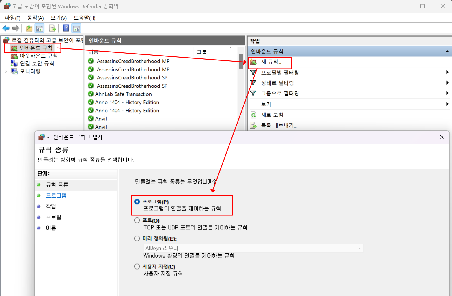 인바운드 규칙 --> 새 규칙 --> 프로그램 을 누르고 (하단에) 다음 클릭