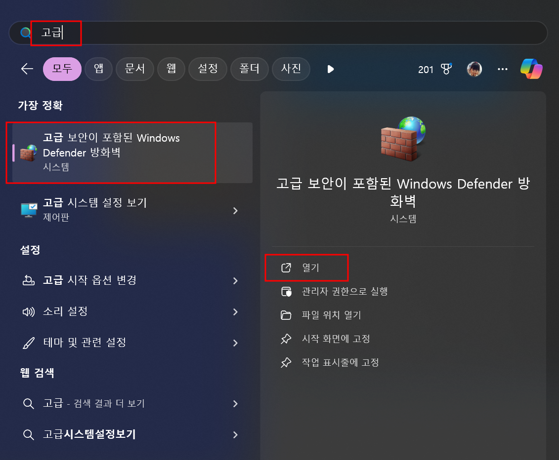 고급 보안이 포함된 Windows Defender 방화벽 버튼을 누릅니다. (혹은 우측에 열기를 누르면 됩니다)