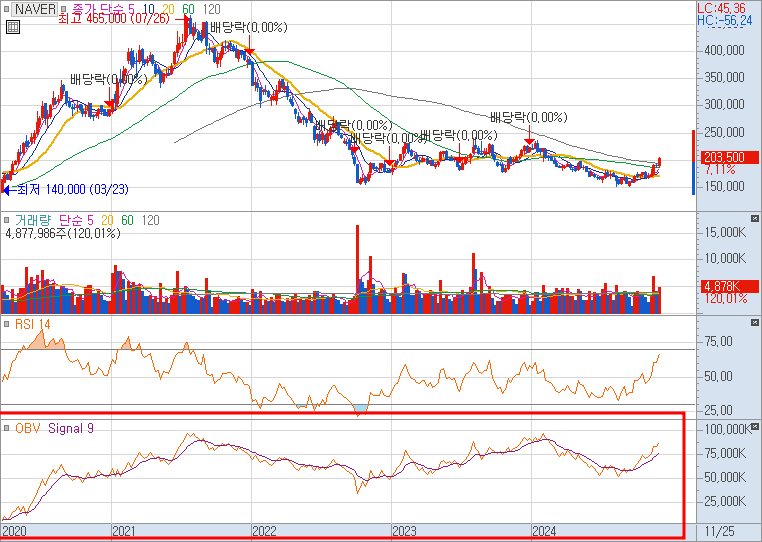 OBV는 거래량을 기반으로 한 누적 지표로, 주가 움직임에 선행하는 경향이 있습니다.