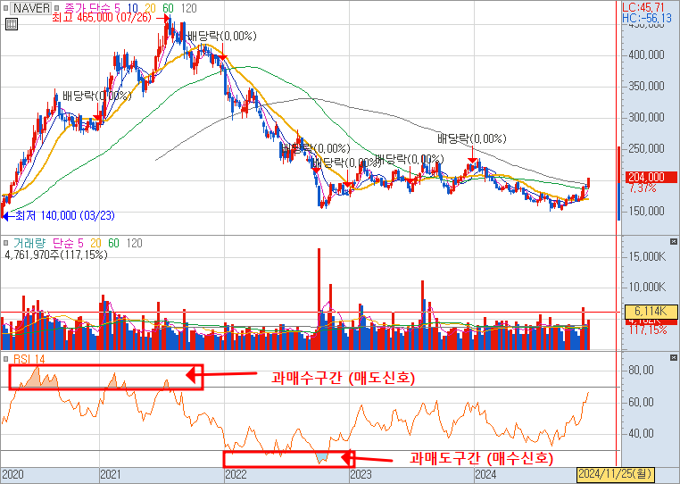 - 상승 전환 신호: RSI가 30 이하의 과매도 구간에서 반등하여 50을 상향 돌파할 때