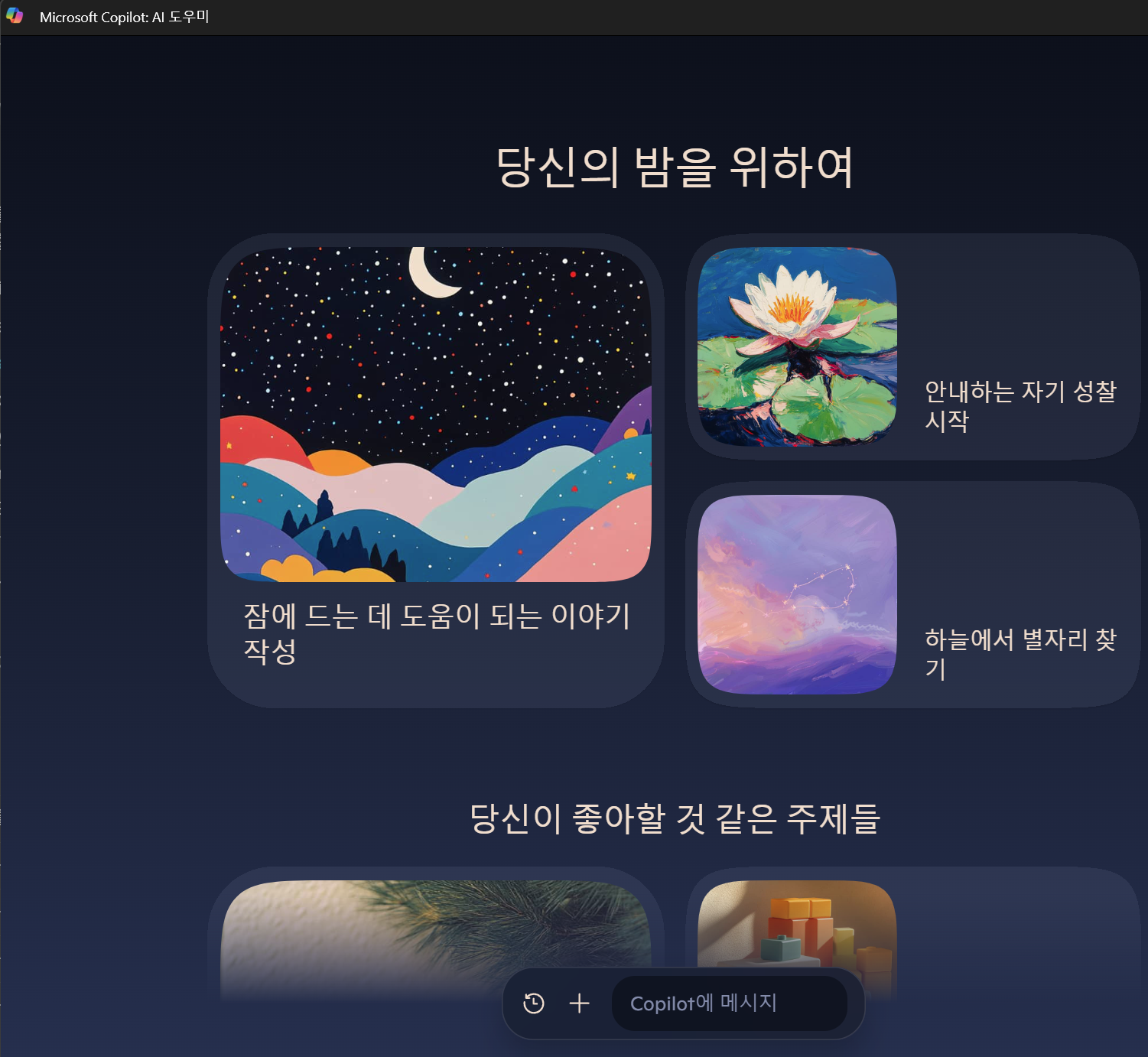 Microsoft Copilot: AI 도우미 화면에서도 이미지를 생성은 할 수 있습니다.