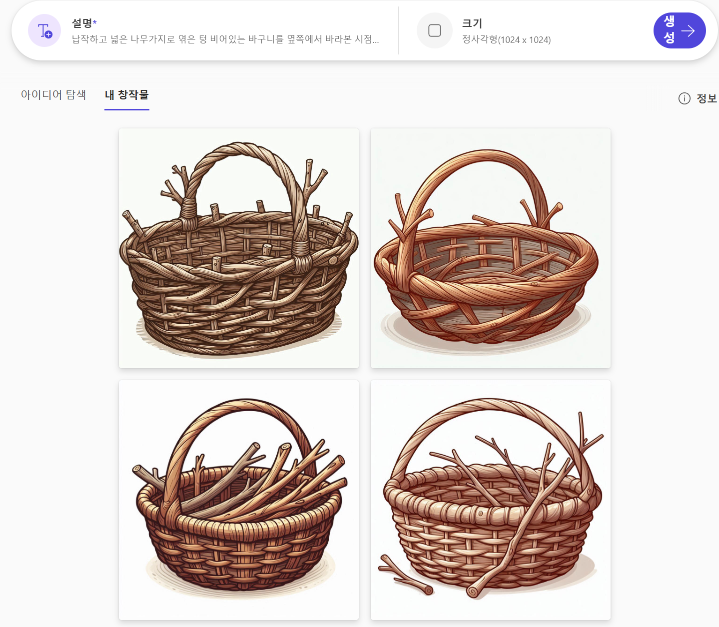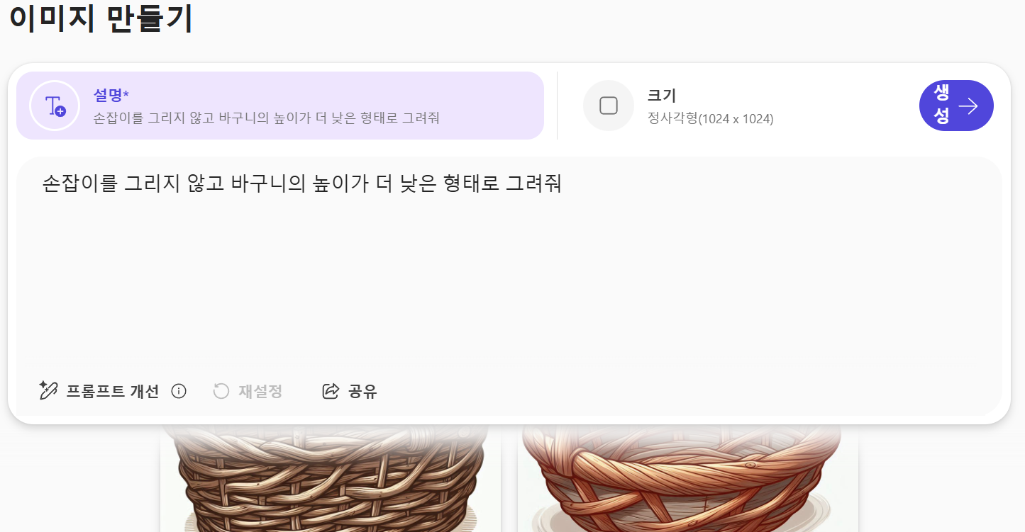 저기서 이미지를 선택하면 아래 화면으로 바뀌는데 그 곳에 같은 텍스트를 입력하고 "생성" 버튼을 눌러 봤습니다.