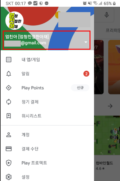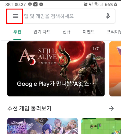 구글 플레이스토어의 메인화면 좌측 상단에 가로줄 세게 아이콘을 눌러서