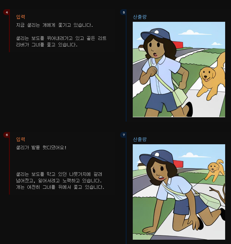 2) 두번째 샘플에서는 웹툰형식으로 일관된 캐릭터를 설명하는 상황에 따라 정확하게 그려줍니다.