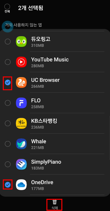 그리고는 삭제하려는 앱을 여러 개 선택 후 아래 삭제를 눌러 앱들을 정리해 줍니다.
