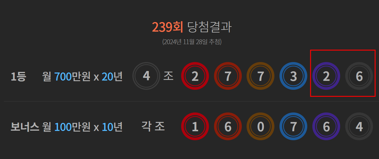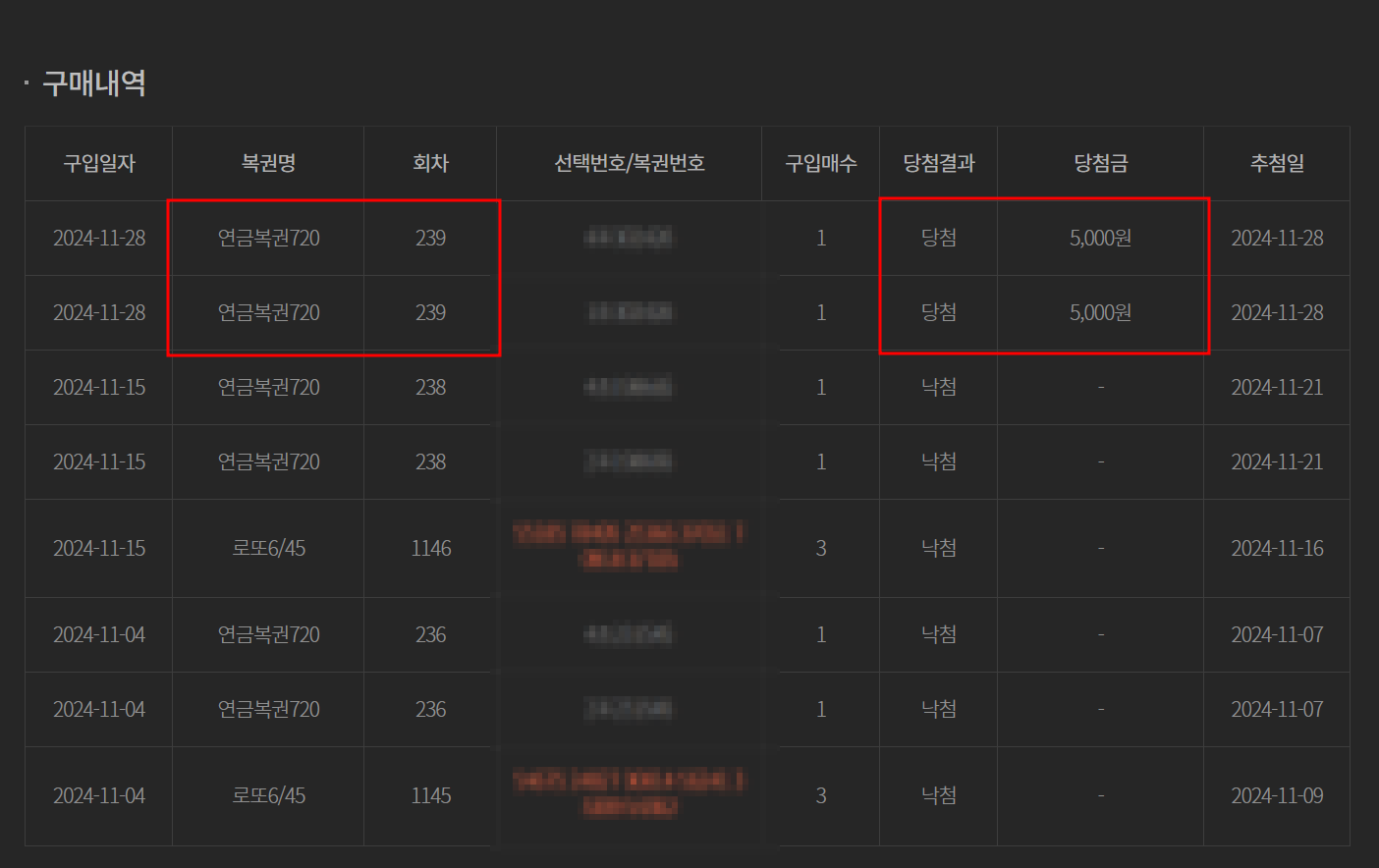 최근에 거의다 낙첨이였다가 11/28일 2장 구매했던 연금복권 모두 5천원권에 당첨이 되었네요 ㅎㅎ