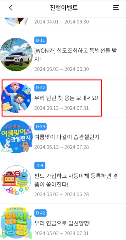 지금 우리은행 앱에서 여러가지 이벤트롤 하고 있는데 2024. 7. 31일까지 진행중인