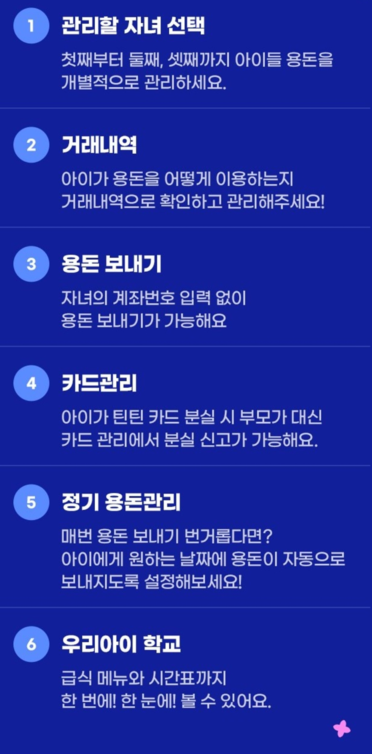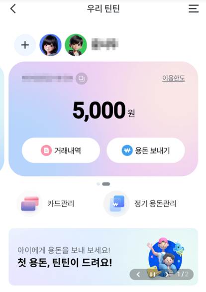 | 우리틴틴은 만 7~18세 자녀가 체크카드나 은행 계좌와 같은 금융기능을 이용할 수 있는 서비스 입니다 |