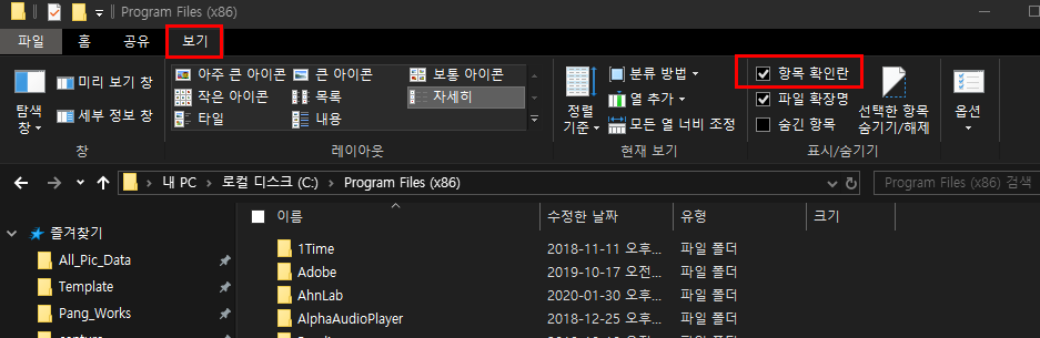 바로 탐색기의 보기 탭 > 항목 확인란을 체크하면 됩니다