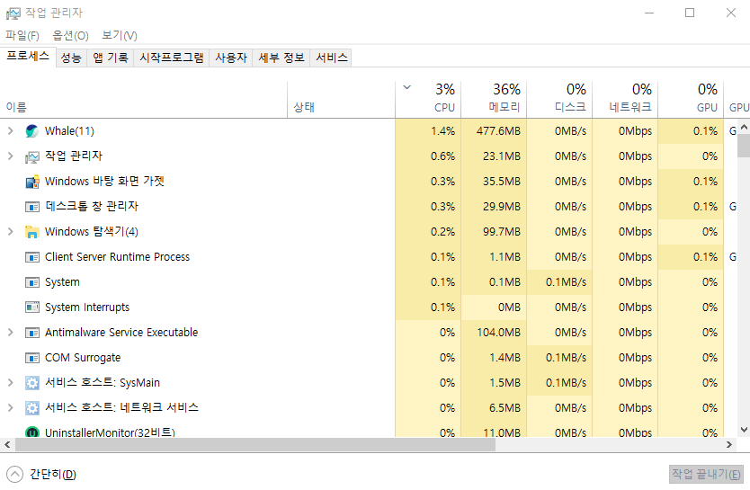 메모리 사용랑과 CUP사용량, 그리고 네트워크 사용량을 한눈에 체크해 볼 수 있습니다.