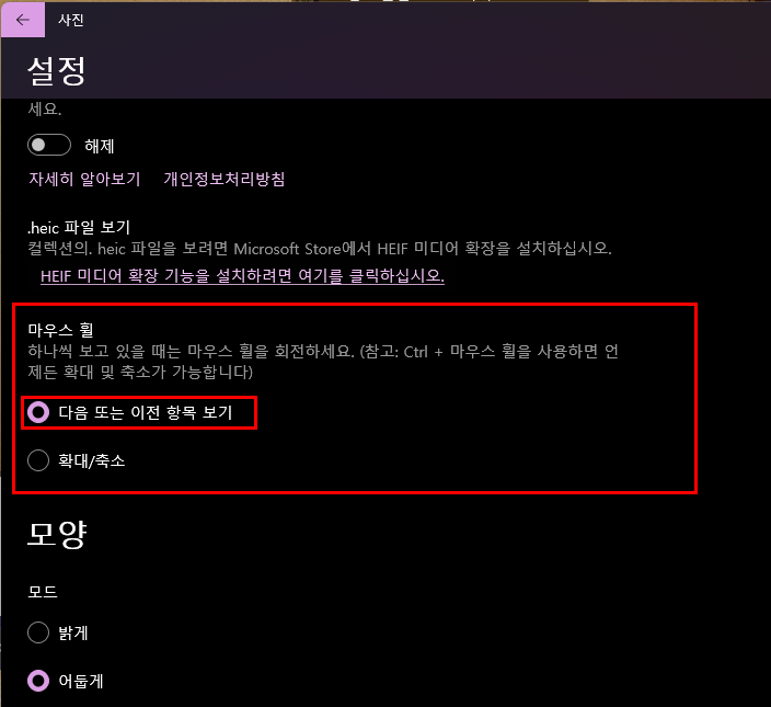 이것을 '마우스 휠'을 돌릴때 다음사진으로 넘길수 있도록 옵션을 바꿀수 있습니다.