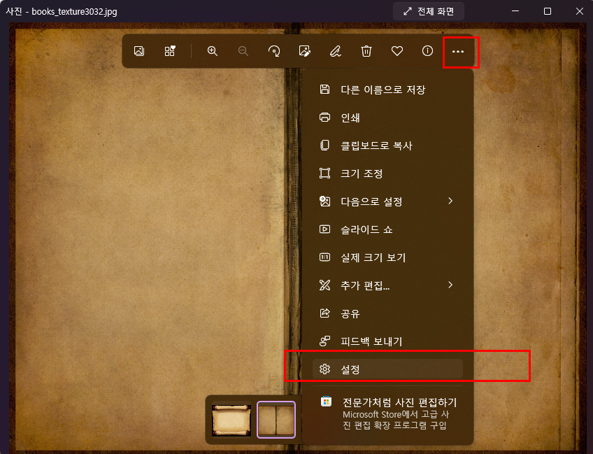아래 와 같이 사진뷰어 우상단에 … 버튼을 누르고 > 설정을 클릭합니다.