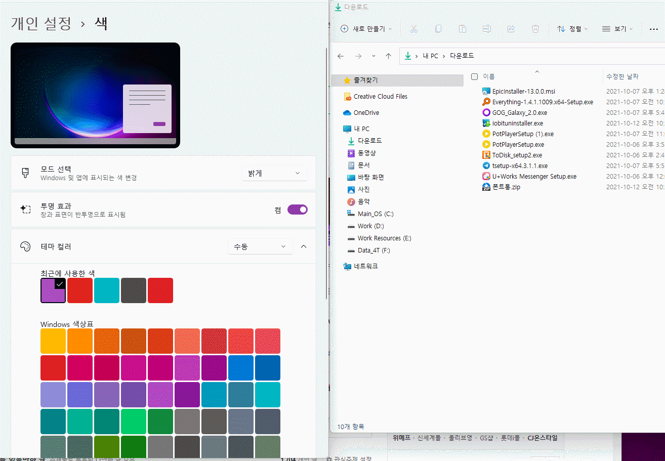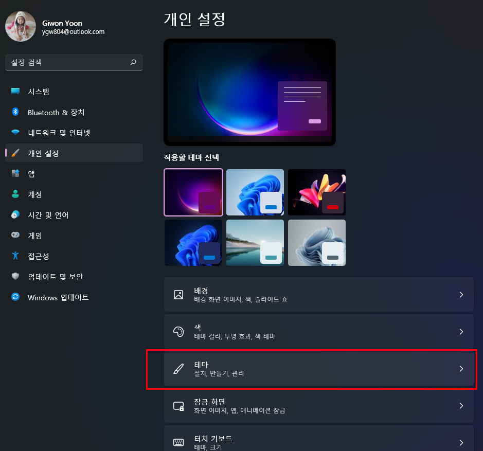 윈도우11에서 테마를 변경하는 방법은 매우 간단 합니다. (윈도우10과 동일)