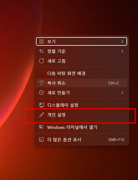바탕화면 빈곳에 우클릭 > 개인 설정 > 테마