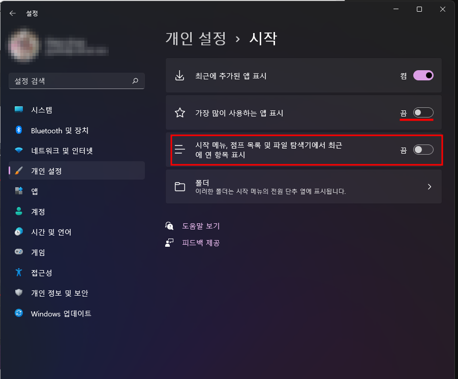 '시작 메뉴, 점프 목록 및 파일 탐색기에서 최근에 연 항목 표시 부분을 끔 상태로 바꿔주면 됩니다