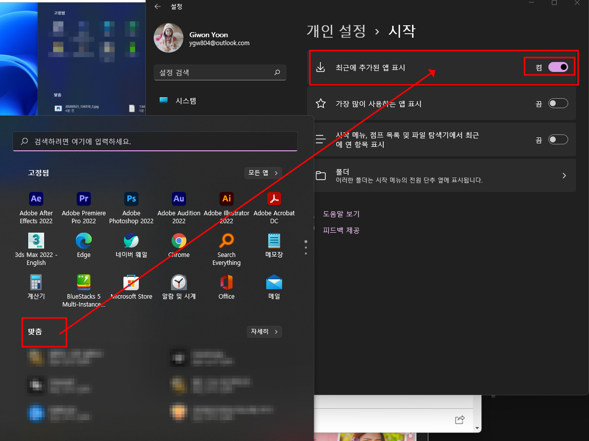 윈도우11 시작메뉴 최근에 사용한 파일 목록 간단제거 방법