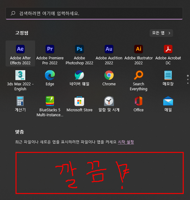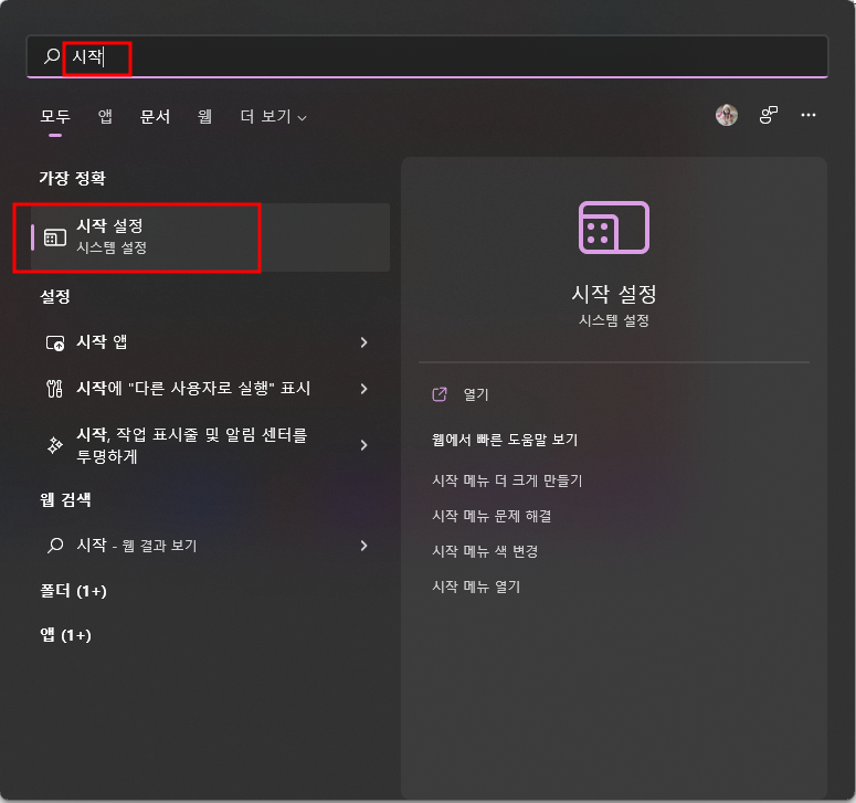 윈도우 키를 누르고 검색에 '시작' 이라고 씁니다.