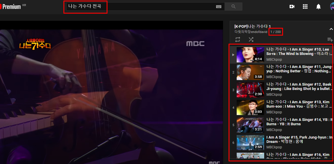 예를 들어 유튜브에 '나는 가수다 전곡'이라고 검색을 하고 그것을 모아놓은 영상을 발견했습니다.