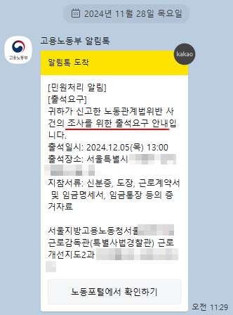 11월 28일 해당 노동청에 직접 출석을 하시면