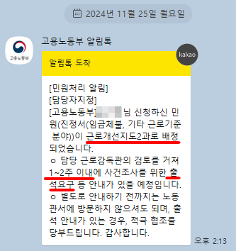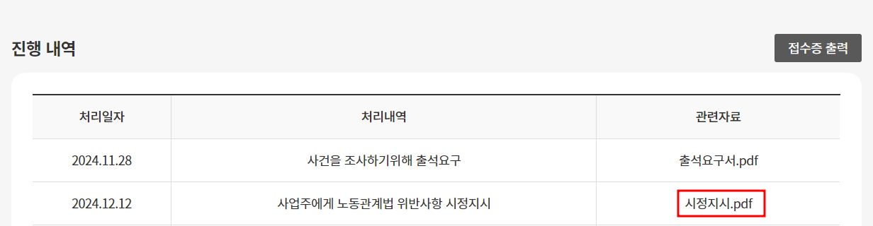 몇일 후 "사업주에게 노동관계법 위반사항 시정지시" 단계로 넘어 갔습니다