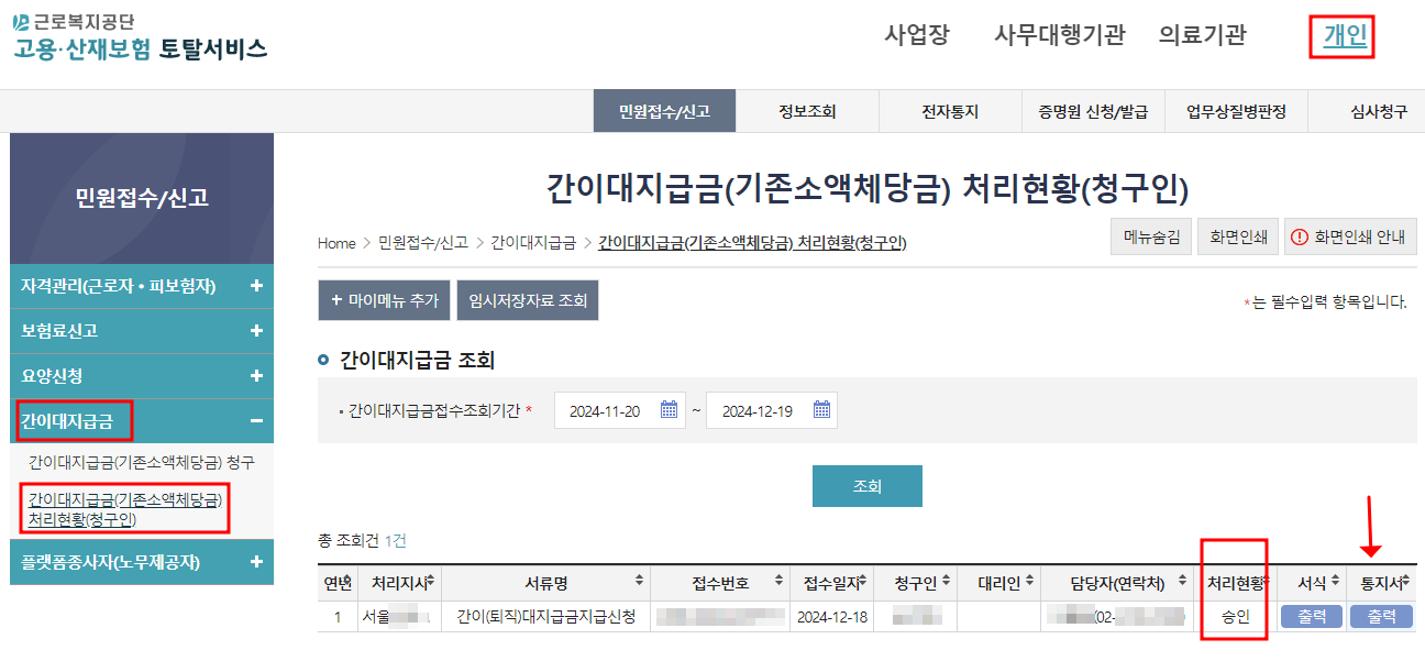 바뀐것은 처리현황이 "승인" 상태로 바뀐것과 통지서 부분이 생겼습니다.