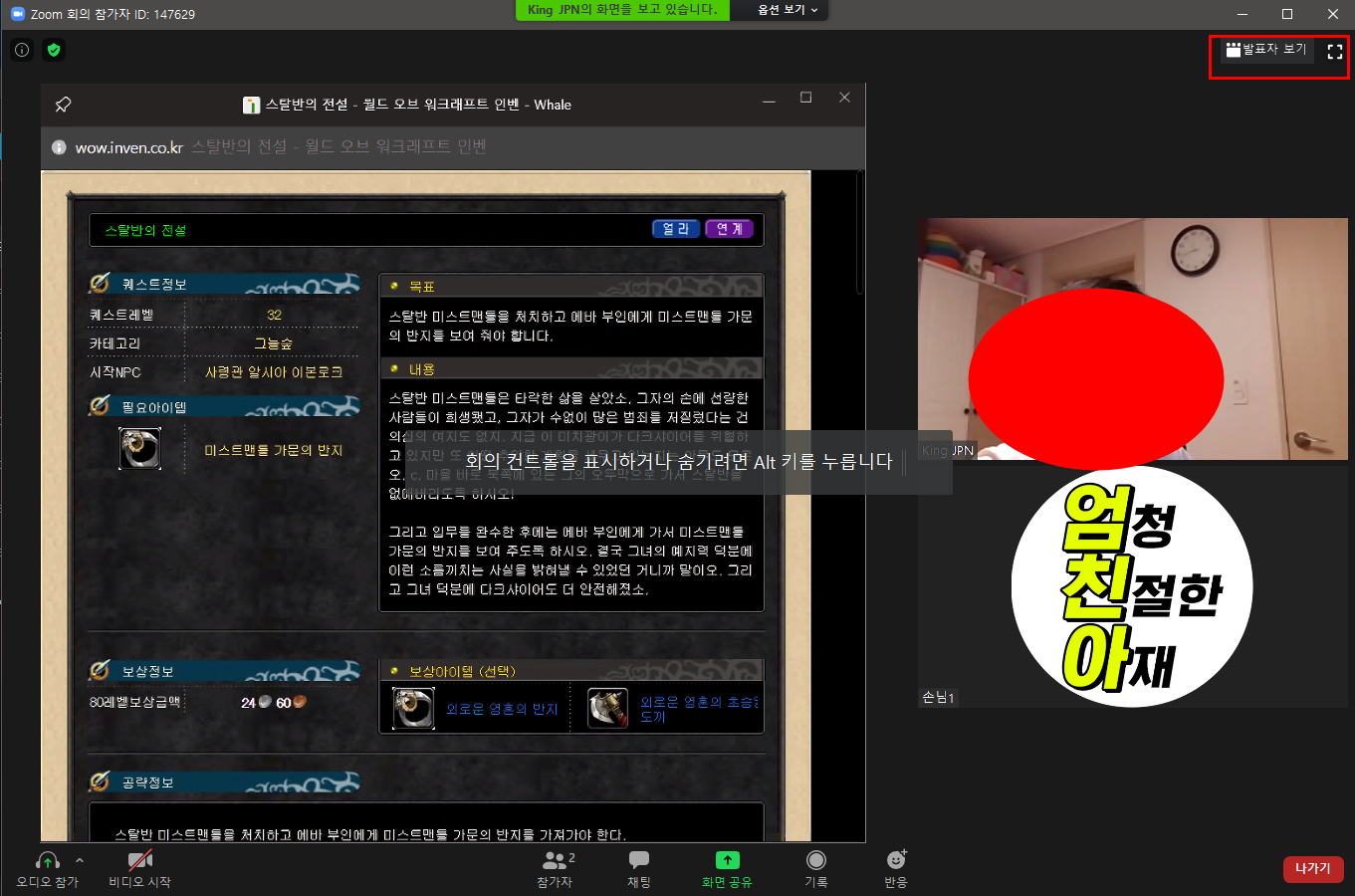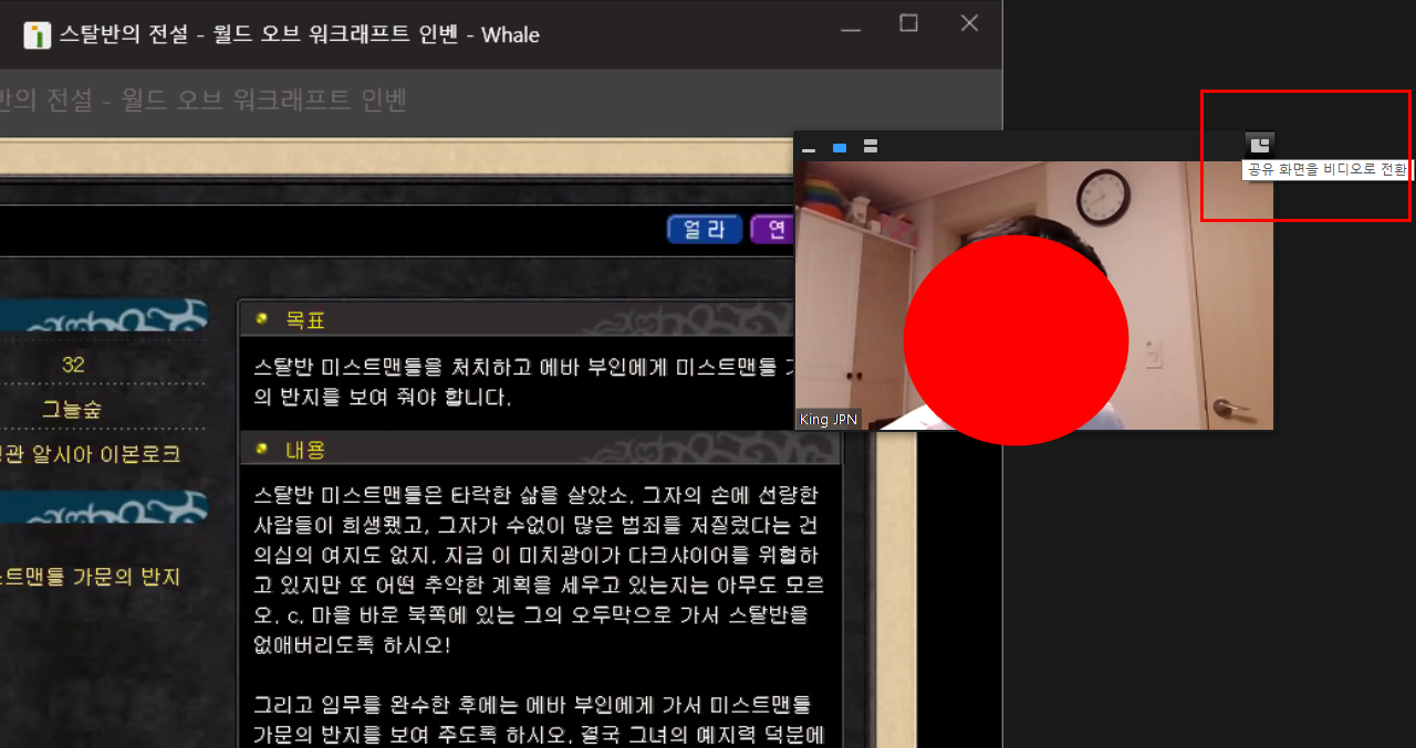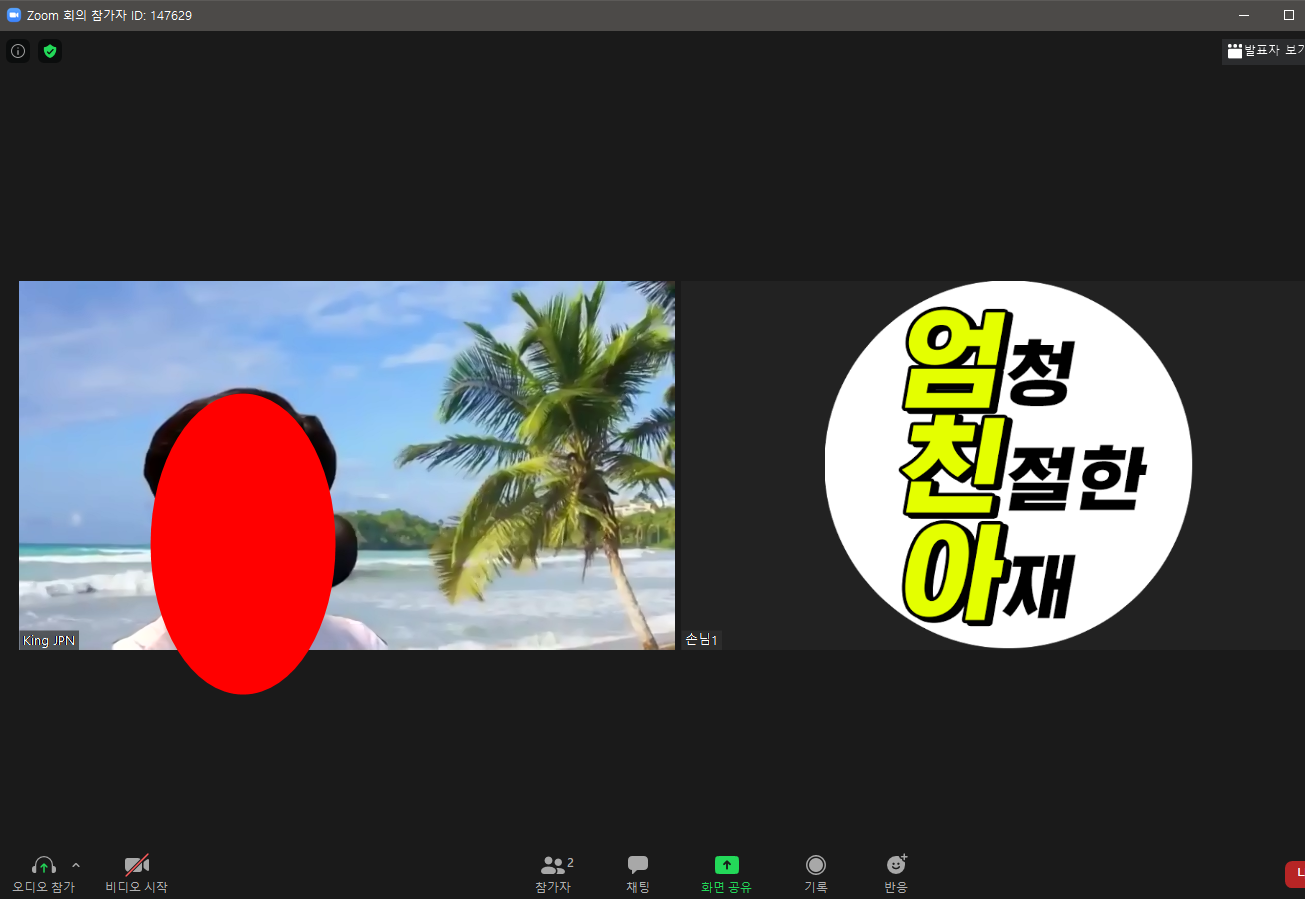 공유 화면을 전환 해서 화면-방장캠 화면의 크기를 전환할수도 있고