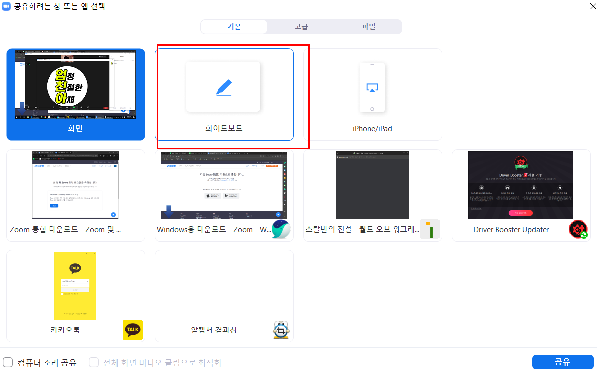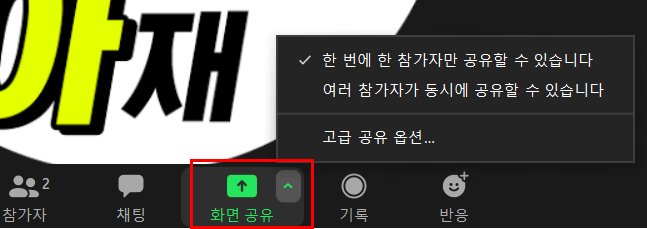 방장은 화면 공유를 눌러 자신이 보고 있는 화면들 중에 하나를 선택해서 회의 참가자에게 공유할수 있습니다.