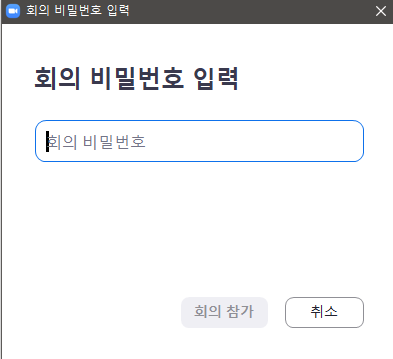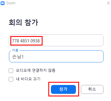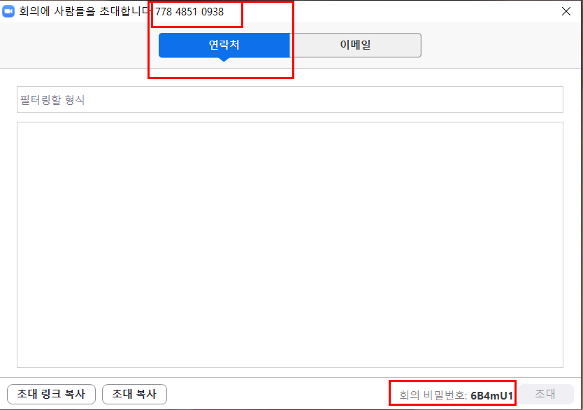 빨간색 네모 부분의 11자리 숫자의 방번호와 회의 비밀번호를 들어올 사람들에게 알려줍니다.
