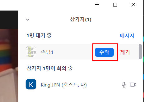 방장은 아랫 부분에 참가자 버튼을 누른다음 참가자를 확인후에 수락 버튼을 눌러줍니다.