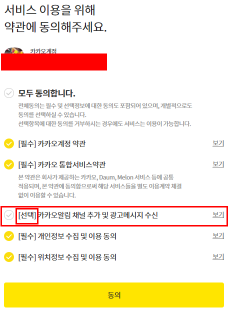 '선택'으로 되어있는 부분은 가급적 체크 해지하고 동의버튼을 누르는 습관을 가집시다