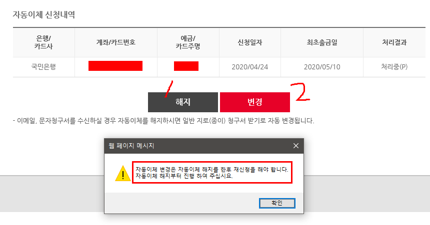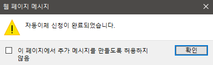 정상적으로 자동이체 신청이 완료되면 메시지가 뜨고