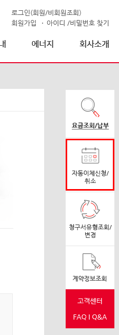 회원가입/로그인이 완료되면 홈페이지 우측 메뉴에 달려 있는 '자동이체신청/취소' 를 누릅니다.