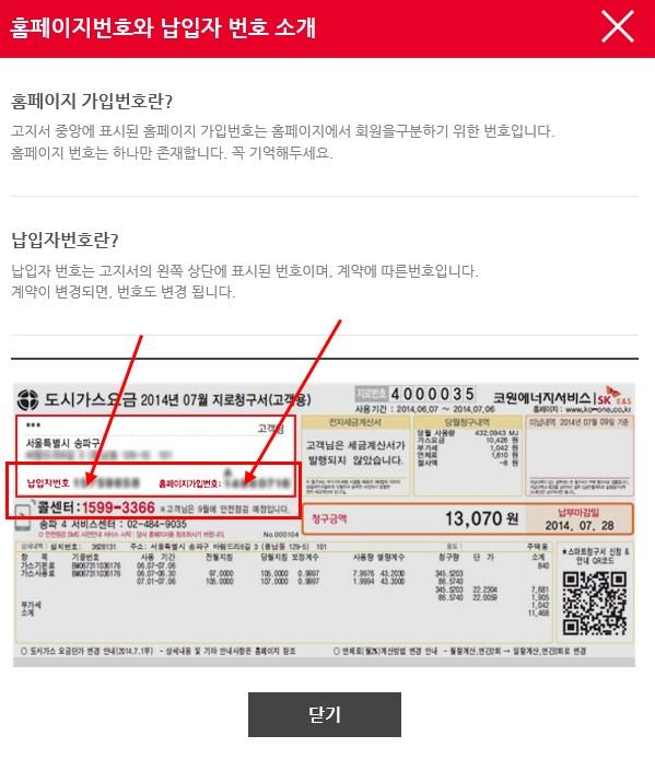 홈페이지번호와 납입자 번호가 적혀있는데 그것을 참조하시면 됩니다.