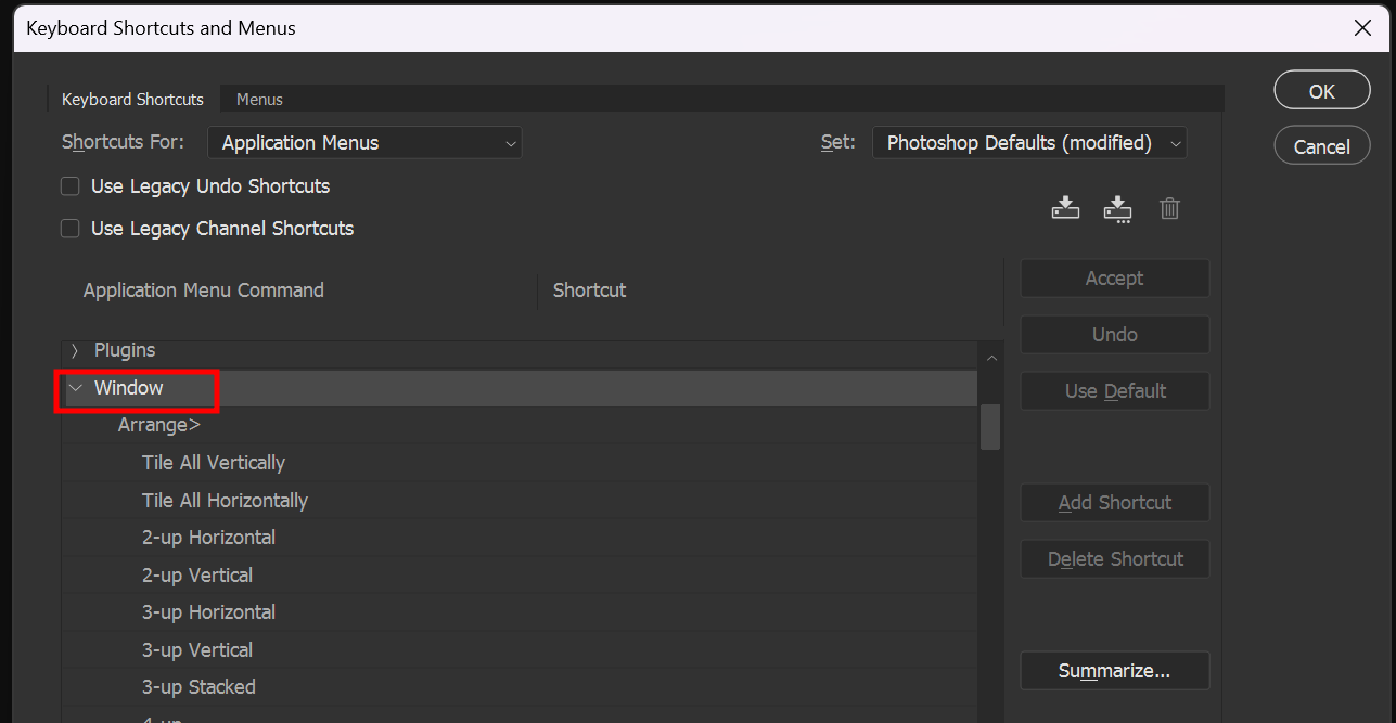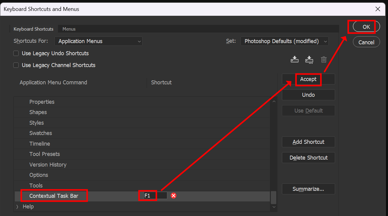아래 순서대로 원하는 단축키를 넣고 Accept - OK 순으로 저장합니다 (포토샵 한글판은 명칭이 다를수 있음)