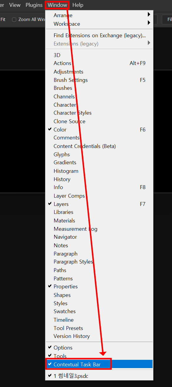 포토샵 상단에 있는 Window - (하단쪽에 보시면) 상황별 작업표시줄(Contextual Task Bar) 을 다시 켜주시면 됩니다.