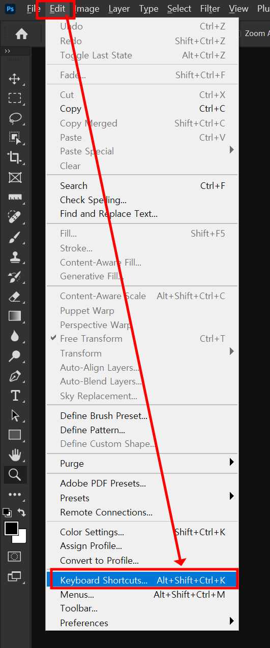 단축키(Shortcuts) 할당창을 불러오는 방법은 상단메뉴에 Edit - Keyboard Shortcuts를 누르거나