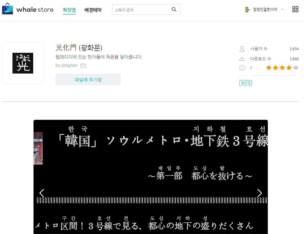 한자독음을 달아주는 웨일 브라우저 확장앱 - 광화문