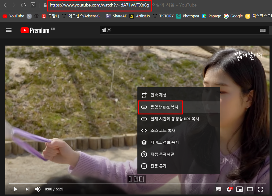 - 영상에서 우클릭해 나오는 동영상 URL 복사 를 누르셔도 좋습니다.