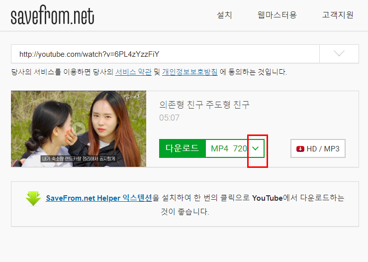 기본적으로 MP4 확장자의 720p 사이즈로 다운로드가 됩니다.