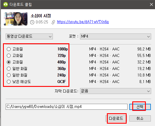 원하는 화질을 선택하고 다운로드 버튼을 누르면 끝!!