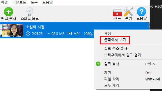 다운로드 받은 폴더가 생각이 나지 않을땐 받은 영상에 우클릭하여 폴더에서 보기를 누르면 폴더가 열립니다.