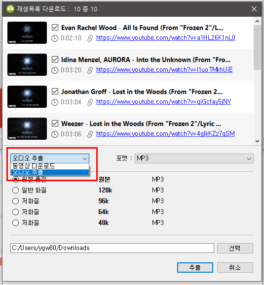 음악 재생목록이기 때문에 아래 처럼 동영상 다운로드를 > 오디오 추출로 바꿔줍니다