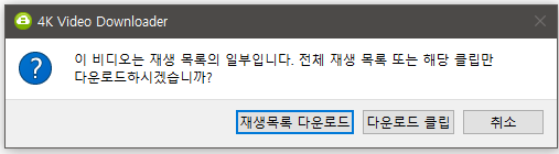 아래와 같은 팝업으로 재생목록 다운로드와, 현재 재생되고 있는 영상(다운로드 클립)을 선택할수 있습니다.