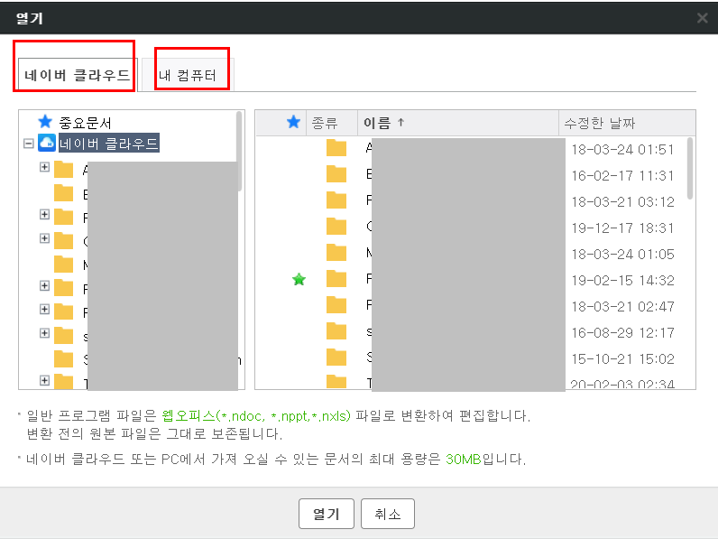 열기를 누르면 클라우드에서 열지, 내 컴퓨터에서 열지를 결정합니다